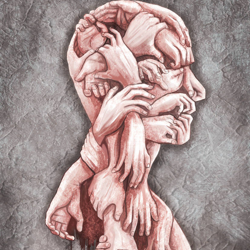 Alles draait ineens om hem heen. Zijn voeten glijden over de grond. Tijdens de afdaling probeert hij zich los te rukken, schopt met de voeten naar alle kanten, ze knallen tegen muur en leuning.
