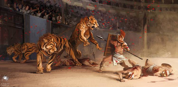 De spelleider betreedt het podium in het decor van een arena.